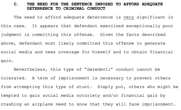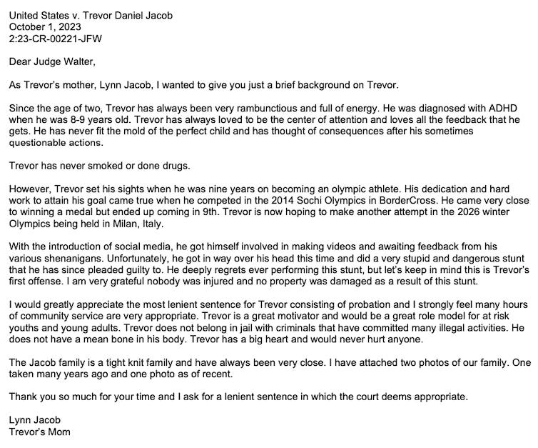 Jacob “most likely committed this offense to generate social media and news coverage for himself and to obtain financial gain,” prosecutors wrote. “Nevertheless, this type of ‘daredevil’ conduct cannot be tolerated.”